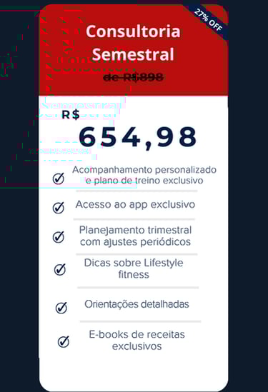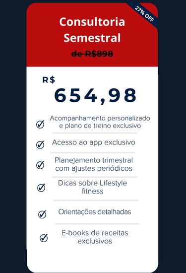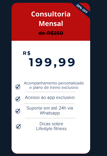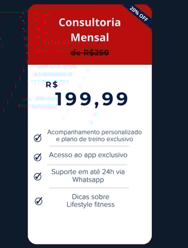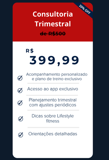 Consultoria Fitness que funciona! Resultados reais, sem enrolação! Treinos personalizados, acompanhamento profissional e um app exclusivo para você alcançar sua melhor versão de forma eficiente. Esqueça os métodos genérico! Seu corpo e seu tempo merecem o melhor!